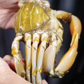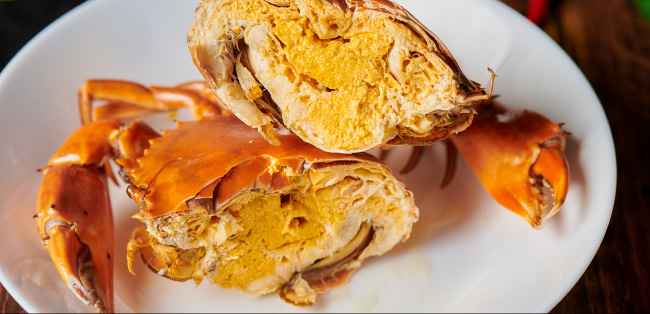 每逢炎夏,青母蟹會在產(chǎn)卵時(shí)棲身于淺灘河畔,在陽光的照射下,體內(nèi)的蟹膏分解成金黃色的油脂,然后滲透到體內(nèi)的各個(gè)部分,使得整只蟹晶瑩剔透、充滿黃油,因此被稱為黃油蟹。